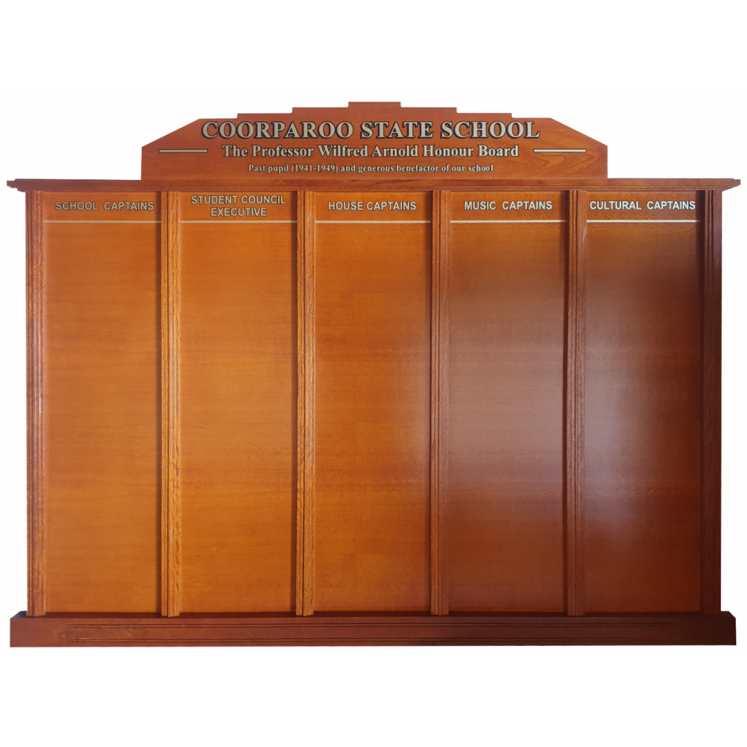 Honour Board 8 is a refined, multi-panel honour board design featuring clean vertical divisions, a classic peaked or curved top, and beautifully balanced timber finishes. This style is ideal for schools, academic institutions, sporting clubs, community groups, and organisations seeking an elegant and structured presentation.